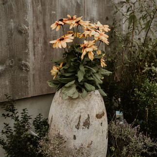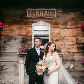 We love to accent what’s already there: think abundant bridal and bridesmaid bouquets that pop against the greenery, a focused ceremony moment (two lush urns or a loose, asymmetrical install on the structure), and candlelight with petite compotes or bud vases down the farmhouse tables. In spring, we echo Terrain’s hellebores, ranunculus, and blooming branches; in summer, airy delphinium, garden roses, and herbs; in fall, textural grasses and dahlias. The result feels immersive and intentional, less décor to buy, more impact for your dollar, and a look that feels perfectly “Terrain.”