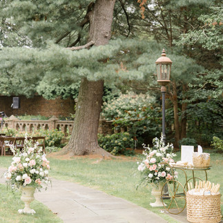 For this stunning outdoor ceremony, we created a soft, romantic floral palette that blended beautifully with Aldie’s historic brick architecture and lush gardens. The ceremony began with a charming welcome vignette - a woven basket of paper parasols and fans displayed alongside delicate blush and white blooms, inviting guests to relax and enjoy the day.