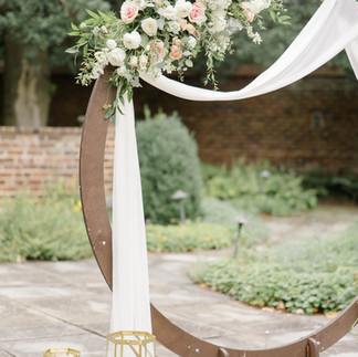 At the heart of the courtyard stood a circular ceremony arch, draped in flowing ivory fabric and adorned with arrangements of roses, ranunculus, lisianthus, and trailing greenery. The floral design echoed the surrounding garden’s soft pastels - featuring blush, cream, and hints of dusty blue - perfectly capturing that refined yet natural aesthetic Aldie is known for.
