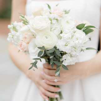The bride carried a stunning hand-tied bouquet of ivory and blush roses, white ranunculus, lisianthus, and delicate stock blooms, accented with touches of eucalyptus for natural texture. The palette of creamy whites and peachy blush tones photographed beautifully against her classic white gown, giving a look that felt both refined and effortlessly romantic.