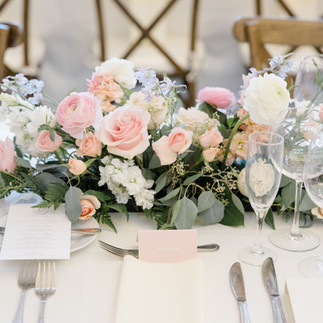 The reception inside Aldie Mansion was a vision of timeless romance and refined beauty. To carry the soft, garden-inspired aesthetic indoors, the floral design featured lush low arrangements of blush and ivory blooms - including roses, ranunculus, lisianthus, and delphinium - accented with silvery eucalyptus and trailing greenery. The florals flowed naturally across the long tables, complementing soft candlelight and gold accents for a warm, inviting glow.